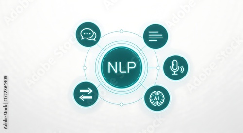 Digital graphic illustrating Natural Language Processing (NLP) with icons for chat, text, voice, AI, and translation.