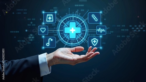 Digital healthcare innovation and future medical technology with virtual interface icons above open hand on blue background