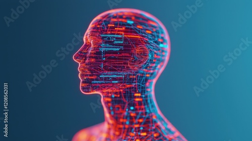 Digital Human Head with Circuit Design in Neon Colors