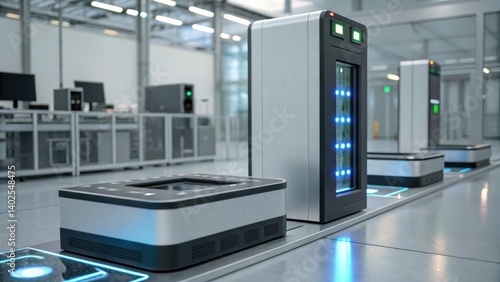 Digital Identity + Biometric Authentication + Security concept, Automated technology components in a modern manufacturing facility, showcasing advanced robotics.