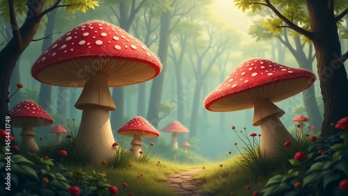 digital illustration forest scene group red toadstools white spots their caps standing center mushrooms surrounded tall trees green leaves branches small red flowers scattered throughout scene