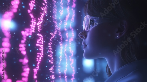 Digital illustration of a researcher analyzing complex data from integrated biotech and computer systems, focus on detailed gene sequences displayed