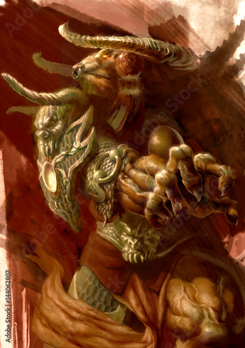 digital illustration of fantasy character Tauren dress in ancient chinese style of armor