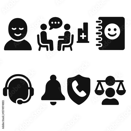Digital Mental Health Icons. Solid style icons of digital mental health support: calm user profile, therapy session icon, mental