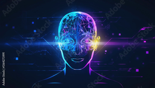 Digital Mindscape: An abstract representation of a human face intertwined with intricate digital patterns, glowing with vibrant, futuristic neon colors.