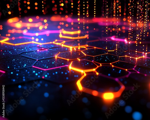 Digital network connection illustration on a black background, showcasing futuristic hexagon perspective and big data landscape in 3D