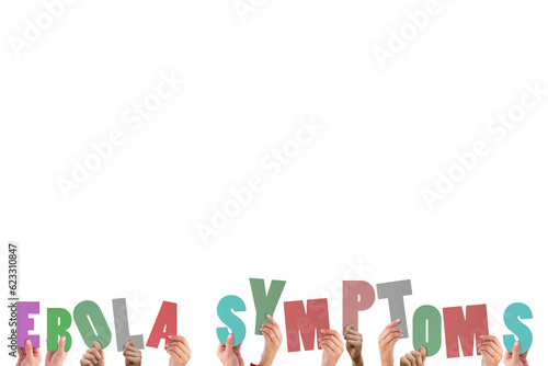 Digital png illustration of hands holding ebola symptoms text on transparent background