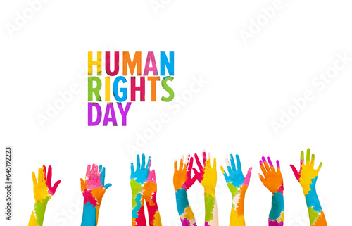 Digital png of colourful human rights day text and raised hands on transparent background