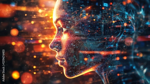 Digital Portrait: A profile view of a head with intricate circuit patterns and dynamic light effects