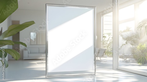 digital render of a modern minimalist glass and chrome wall frame mockup floating in a bright natural lit Scandinavian style living area with an open concept spacious and clean interior design