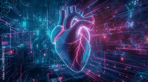 Digital rendering of a human heart with neon pink and blue lights, surrounded by circuit-like patterns.