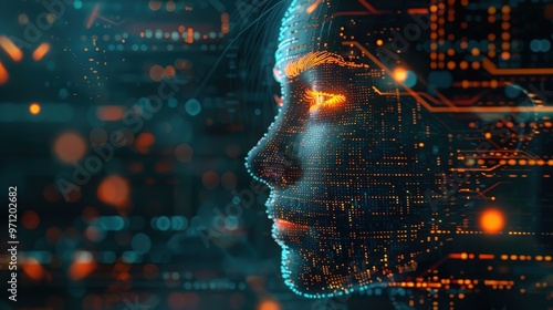 Digital representation of a human face illuminated by glowing data connections in a futuristic cyber environment. Generative AI