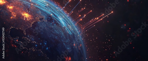 Digital Representation of Earth with Light Trails and Cosmic Elements
