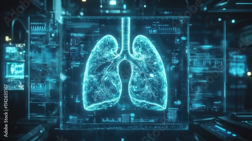 digital representation of human lungs, rendered in a glowing blue hue. The lungs are shown in a semi-transparent, highlighting the intricate network of bronchi and blood vessels within.