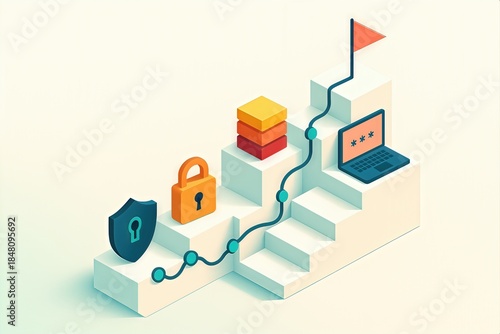Digital security progress depicted through a conceptual illustration featuring essential elements like a padlock laptop shield and colorful data storage reflecting advancement in cyber