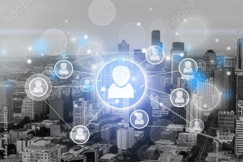 Digital signs on city background