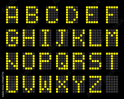 Digital terminal table led font, with grid, yellow isolated on black background, vector illustration.
