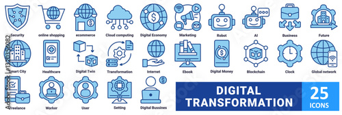 Digital transformation icon set. with icon Security, Online Shopping, Ecommerce, Cloud Computing, Digital Economy, Marketing, Robot, AI, Business, Future, Smart City, Healthcare, Digital Twin