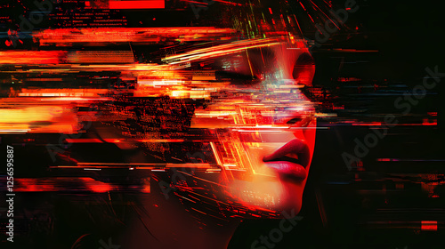 Digital transformation: woman's face merging with glitching data stream, symbolizing fusion of human and technology. Glitching Reality. Illustration