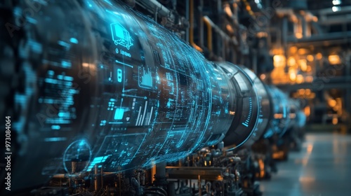 Digital twin of an industrial air with digital overlay showing data and collaboration icons, highlighting the integration between blue rocket on one side