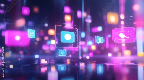 Digital Universe: Neon-lit icons and digital concepts dance in a futuristic cyberspace, highlighting the interconnectedness of the modern technological landscape.