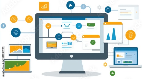 Digital workspace showcasing data analytics and management tools on screens with graphs and icons