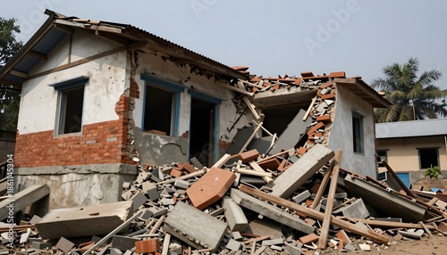 Dilapidated House with Visible Damage and Debris After Demolition in an Urban Environment