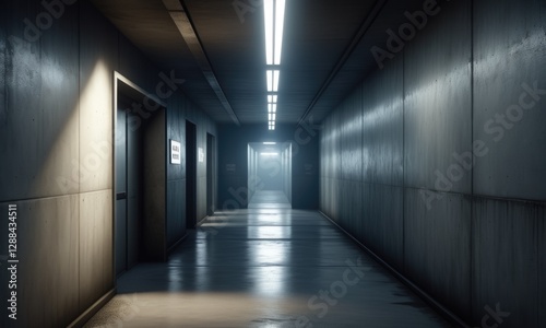 Dimly lit industrial corridor with mysterious atmosphere and moody lighting