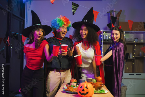 Dinner and group of people celebrating together at Halloween party. Friends are happy and celebrating with food, wine and friendship of love and cheers of champagne at the event.