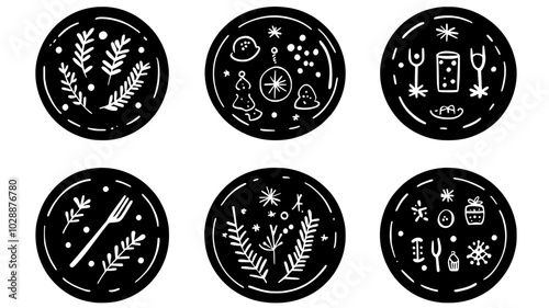 Dinner plates with holiday motifs at each place setting, vector illustration art