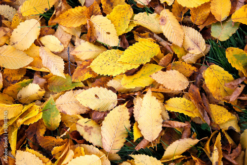 directly above shot of yellow and brown and golden autumn leaves on the ground in the grass in the park