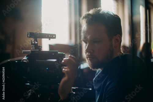 Director of photography with a camera in his hands on the set. Professional videographer at work on filming a movie, commercial or TV series.