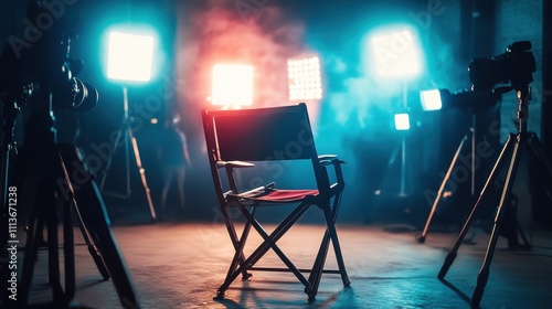 Director's chair surrounded by professional cameras and bright lights in a studio setting.