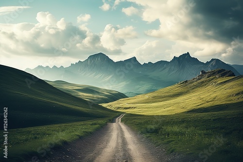 Dirt Path Through Green Hills at Sunset A winding dirt path through lush green hills, leading towards mountains under a vibrant sunset with dramatic clouds.
