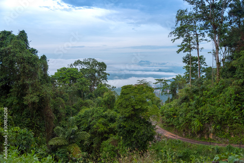 Dirt road between tropical forest and mountain with mist. Colombia.