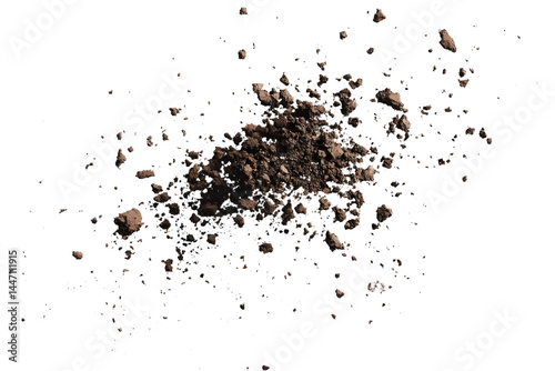 Dirt, soil pile flying isolated on white background