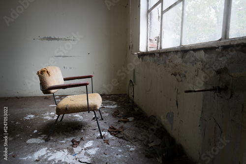 Dirty chair in abandoned room next to window in soft daylight, urban exploration