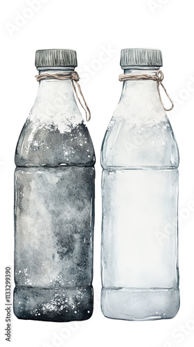 Dirty vs. clean bottles, side by side. Two glass bottles, before and after. Textured glass bottles, contrasting colors.