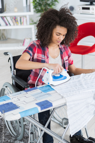 disabled beautiful woman ironing at home