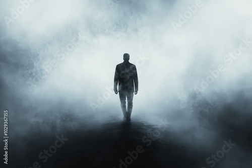 Disappearing Man in Surreal Fog: Abstract Concept Illustration