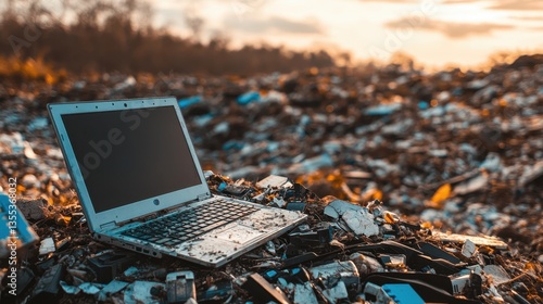 Discarded Laptop in Landfill EWaste Crisis at Sunset.