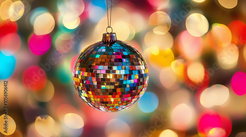 Disco Ball with Colorful Bokeh Lights Background