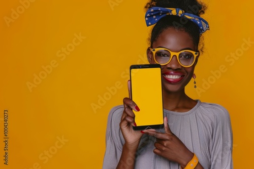 Display mockup afro-american woman in her 40s holding an smartphone with a fully yellow screen