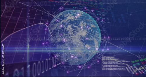 Displaying globe in digital space with network lines, nodes, financial charts and binary code