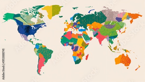 Displaying stylized world map centered on beige canvas, showing colorful patterned countries