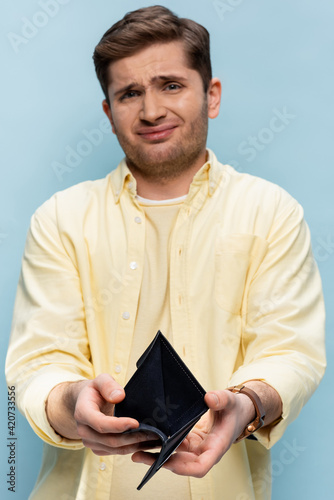 displeased young man in yellow shirt holding empty wallet isolated on blue