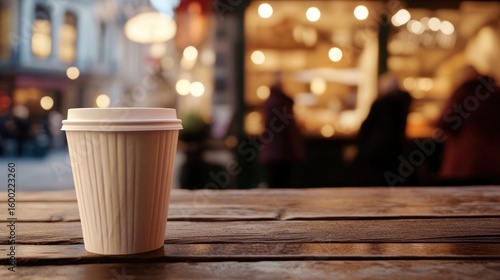 Disposable coffee cup on wooden table, out-of-focus city scene