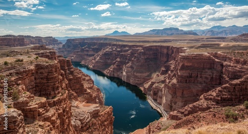 Distant panoramic perspective of a dam reservoir beneath high mountain cliffs