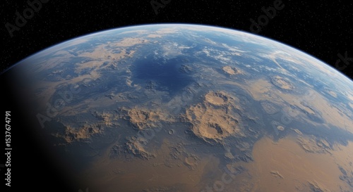 Distant world exploration with blue seas, vast deserts and cratered landscapes