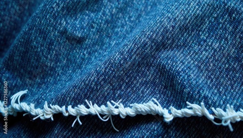 Distressed denim fabric with frayed hem and loose threads, frayed, worn, threadbare